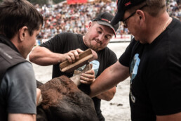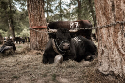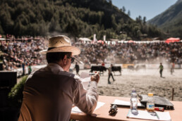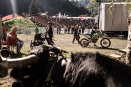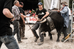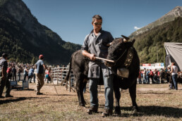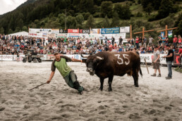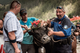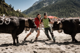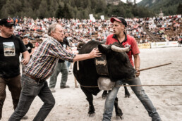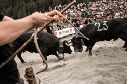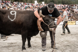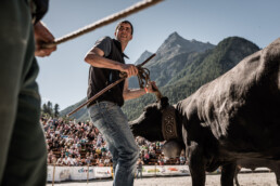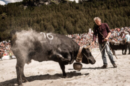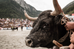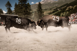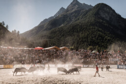 In the newly built arena in Val d'Hérens, competitions take place throughout a summer Sunday. The animals involved are livestock well adapted to the mountains, specifically the breed of Eringer cows or Evolène cows, named after the valley of the same name in the Valais region. The valley lies near the language border (German-French) in Switzerland. These cows are not particularly large but are strong and feisty. Cow fights have been a highlight of the Alpine year for decades. © Martina M. Ott